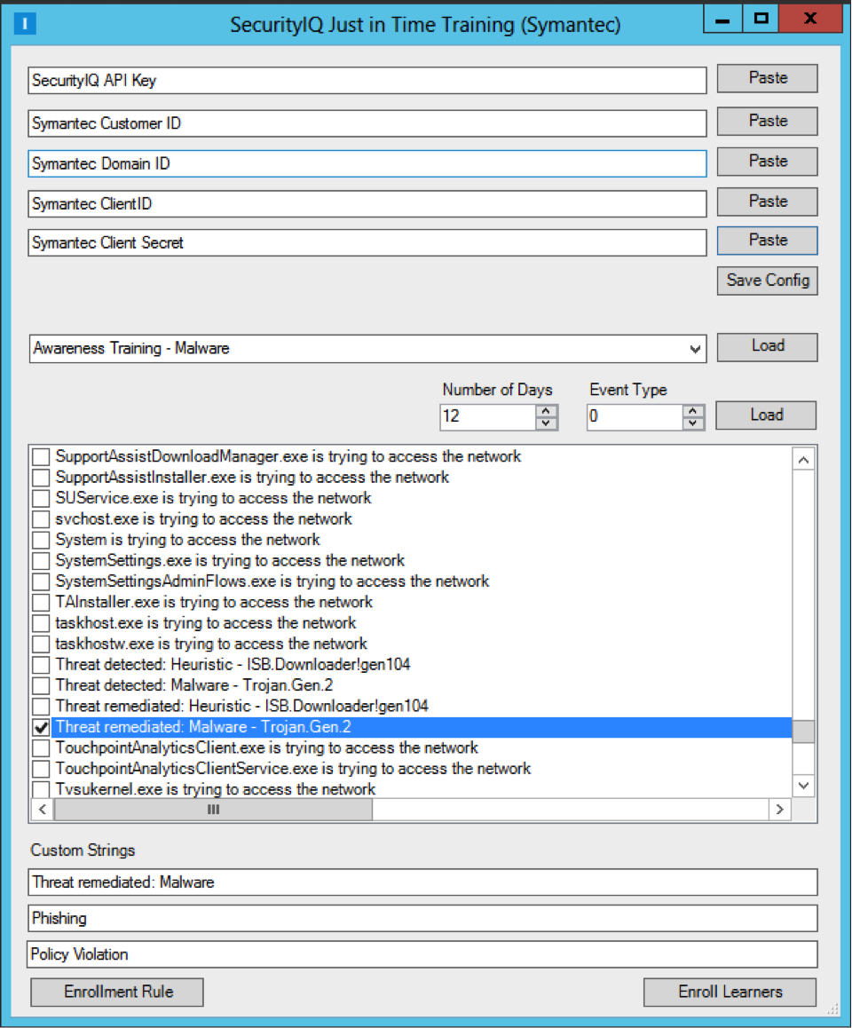 The Infosec IQ Symantec Integration toolset accesses the events in your SEPC via the API. These events will be displayed in Infosec IQ Symantec Integration toolset. The toolset will allow you to make rules that automatically enroll learners into Infosec IQ security awareness training, based on the rules you make via the Infosec IQ API.